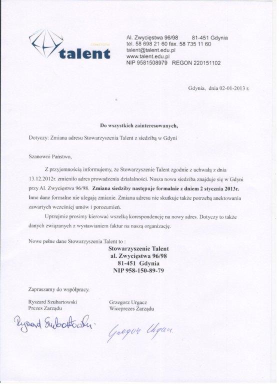 Informujemy, iż zmianie uległ adres siedziby Stowarzyszenia Talent. Wszelką korespondencję prosimy kierować na adres Al. Zwycięstwa 96/98, 81-451 Gdynia.
